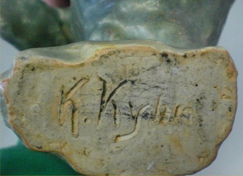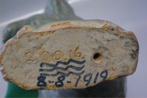 Beskrivelse: Royal Copenhagen stentøj 20016 Kgl. Isbjørn , Knud Kyhn, 1912 26 cm Signeret 8/8 1919 Den grønne glasur er sikkert et resultat af samarbejdet med Patrick Nordstrøm. I fin og hel stand