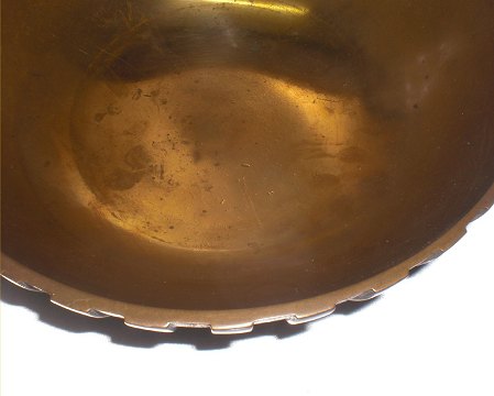 Beskrivelse: SOLGT: Skål af bronce med kanelleret yderside. Stemplet Tinos, Ægte Bronce, Made in Denmark. H. 7,5. Diam. 22. Almindelig alders og brugsslitage Bronzeskål