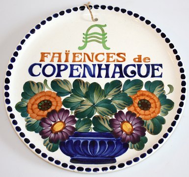 Beskrivelse: Aluminia Fransk forhandler skilt. Mærket 829/445, og signature MP. Copenhagen Denmark. Måler 20,3cm og er i perfekt stand.