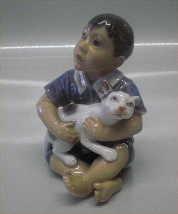 Beskrivelse: Dahl Jensen 1291 Dreng med kat 11 cm (DJ). Mærket med kongelig krone og DJ Copenhagen i hel og fin stand.