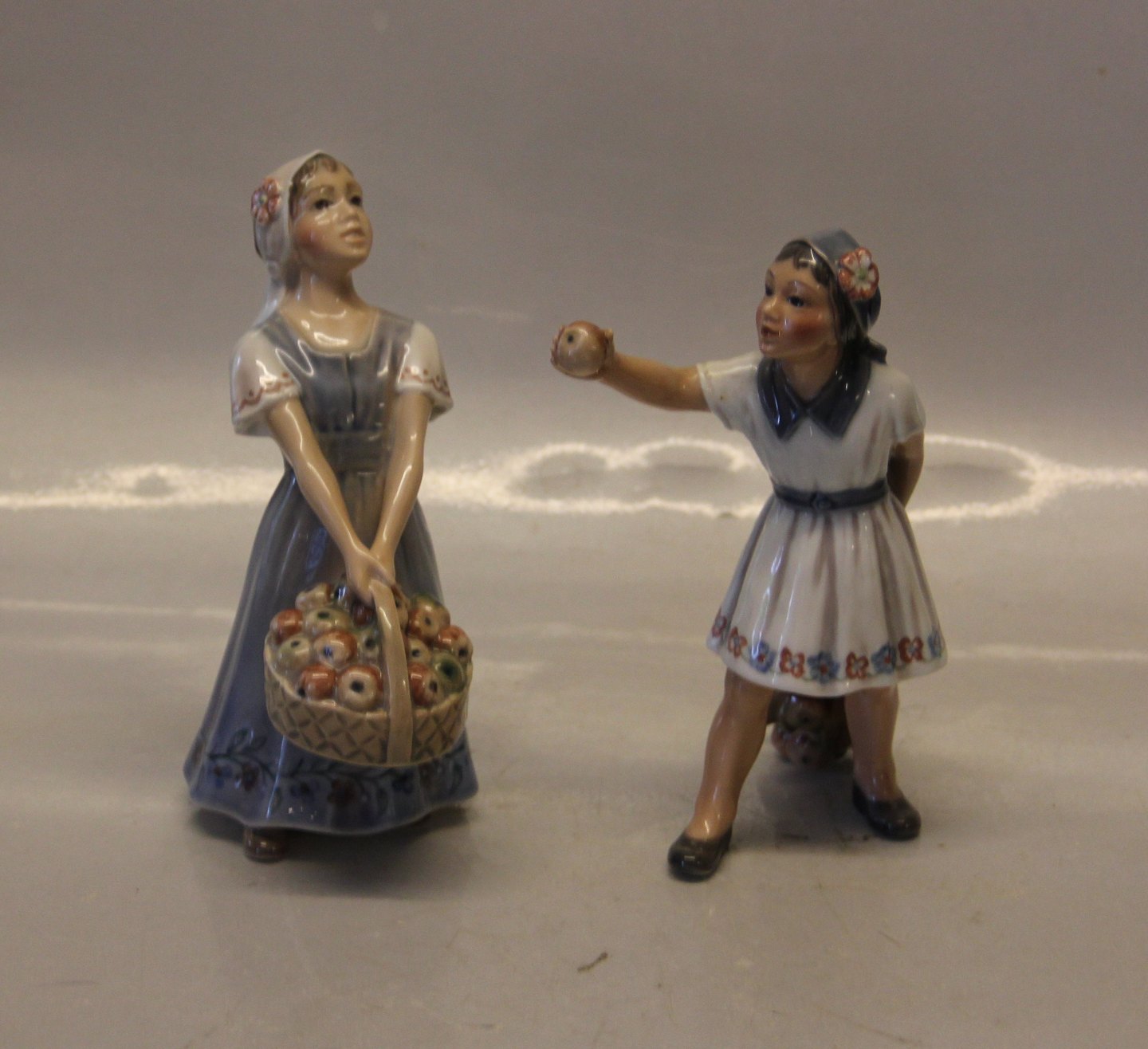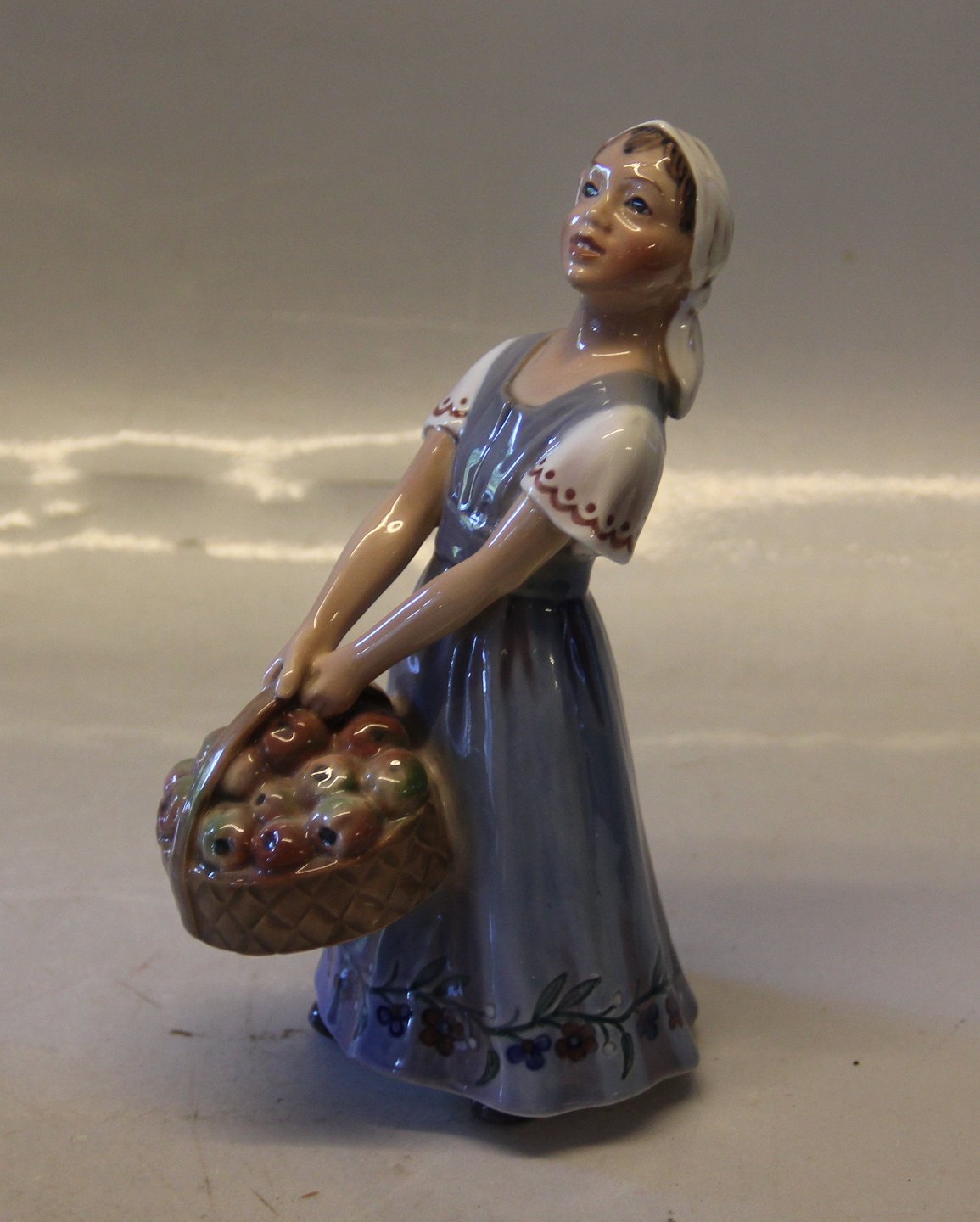Beskrivelse: Dahl Jensen 1287 Pige med æblekurv (DJ) 16,5 cm. Mærket med kongelig krone og DJ Copenhagen i hel og fin stand.