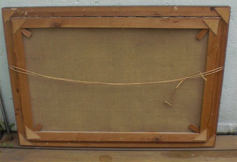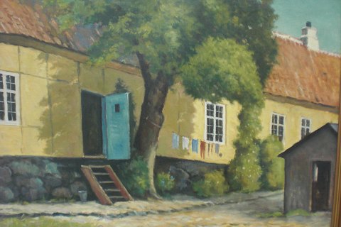 Beskrivelse: Fra Gården I Bryggergården, Teglgade Motiv fra Mariager 75 x 106 cm inklusiv fin guldramme. Olie på lærred