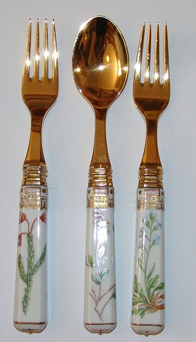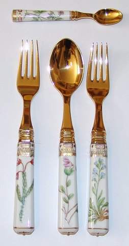 Flora Danica Dessert Bestik i porcelæn og forgyldt Sterling Sølv.