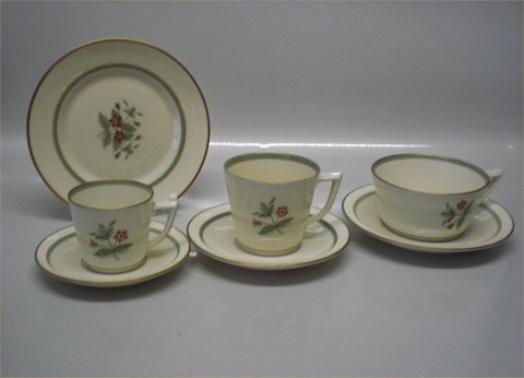 Kgl. 1010 Fensmark : Cremefarvet glasur, koralrød blomst med grønne blade, grønt bånd og guldfilet. Dekorationen med Rød Arve, populært kaldet "Grine til Middag" Det latinske navn: Ana Gallis Arvensis. Design Thorkild Olsen før 1961