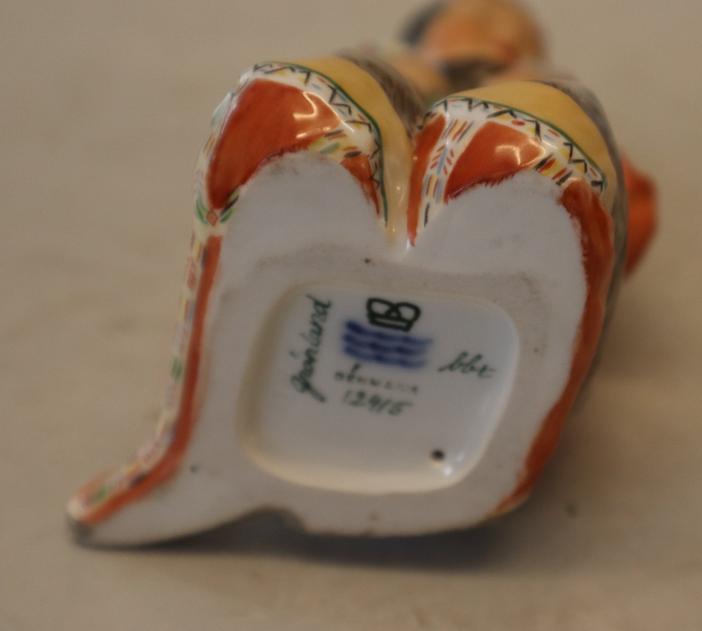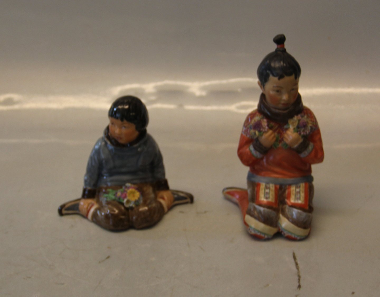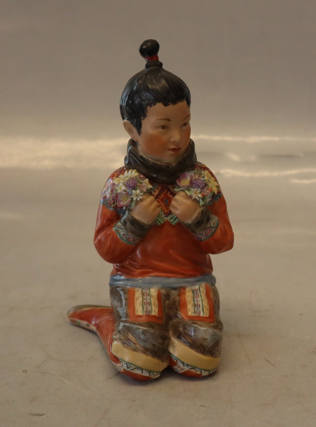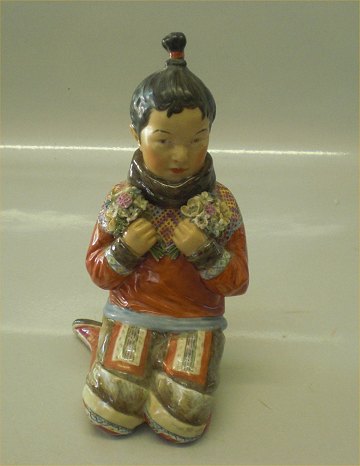 Beskrivelse: Kgl. egnsfigur fra Royal Copenhagen 12415 Grønlandsk pige i nationaldragt - Inuit pige fra Grønland med blomster og perlebroderi -