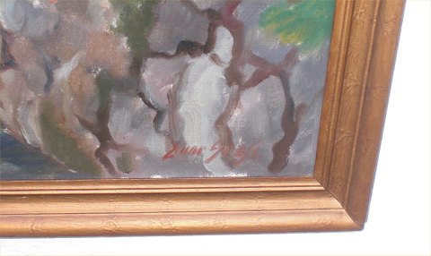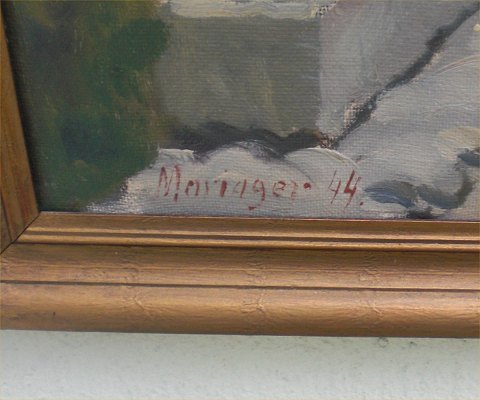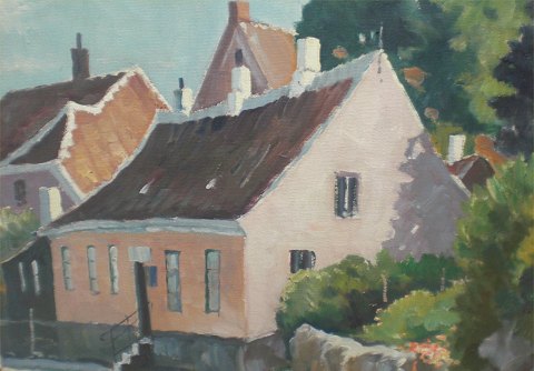Einar Gross (1895-1962) tilhørte en gruppe af malere tilknyttet Løkken og Blokhus. Han kom fra Aalborg og hentede en del af sin motivkreds fra Ålborg og omgivelser. I dette tilfælde har Groos været en tur i Mariager og malet et af de skønne huse. Hans billeder er naturalistiske og forholder sig meget tro mod motivet.