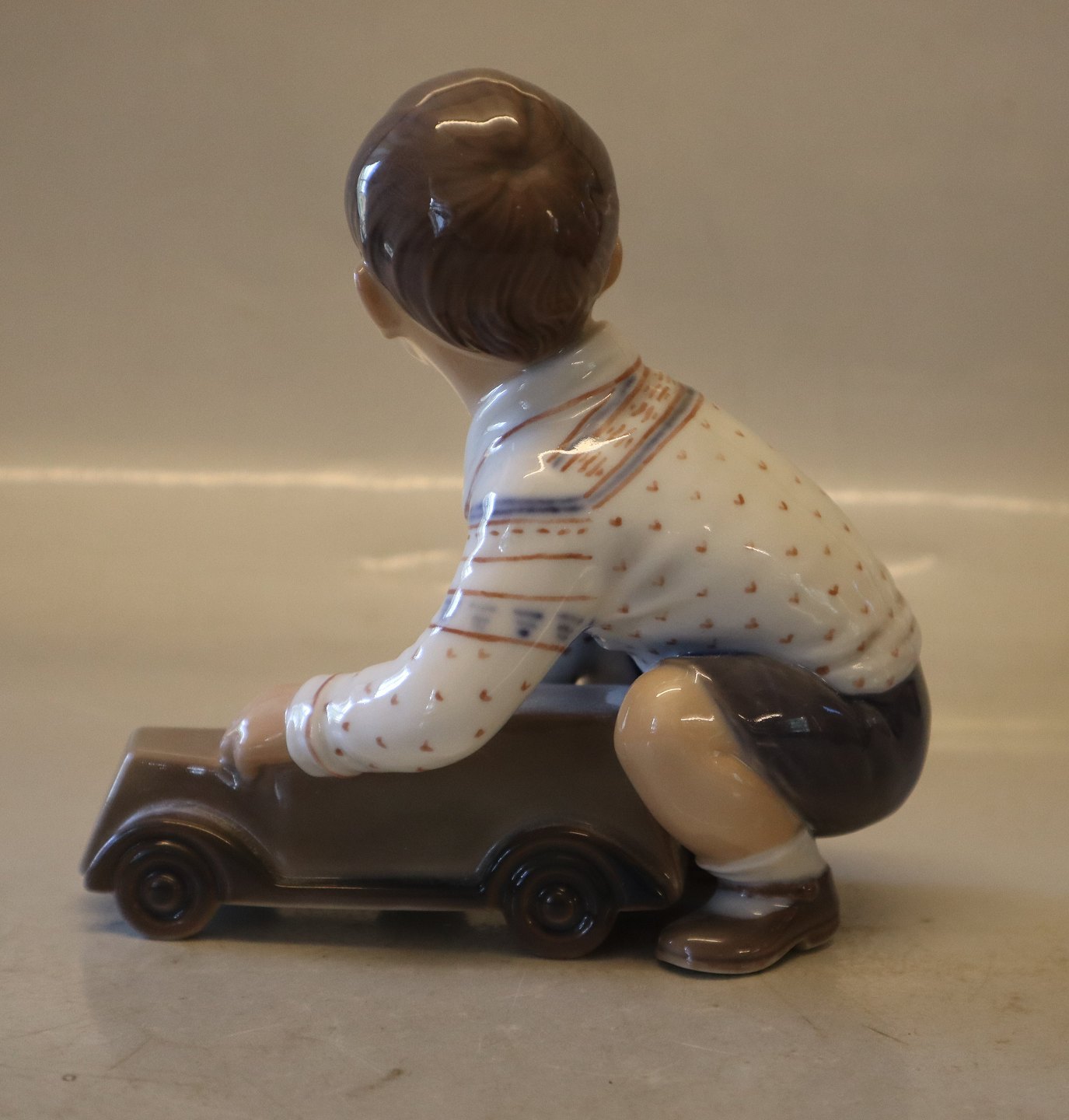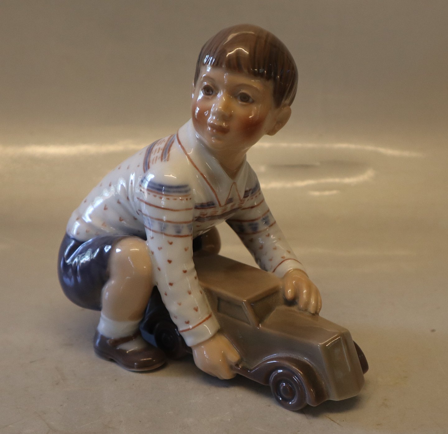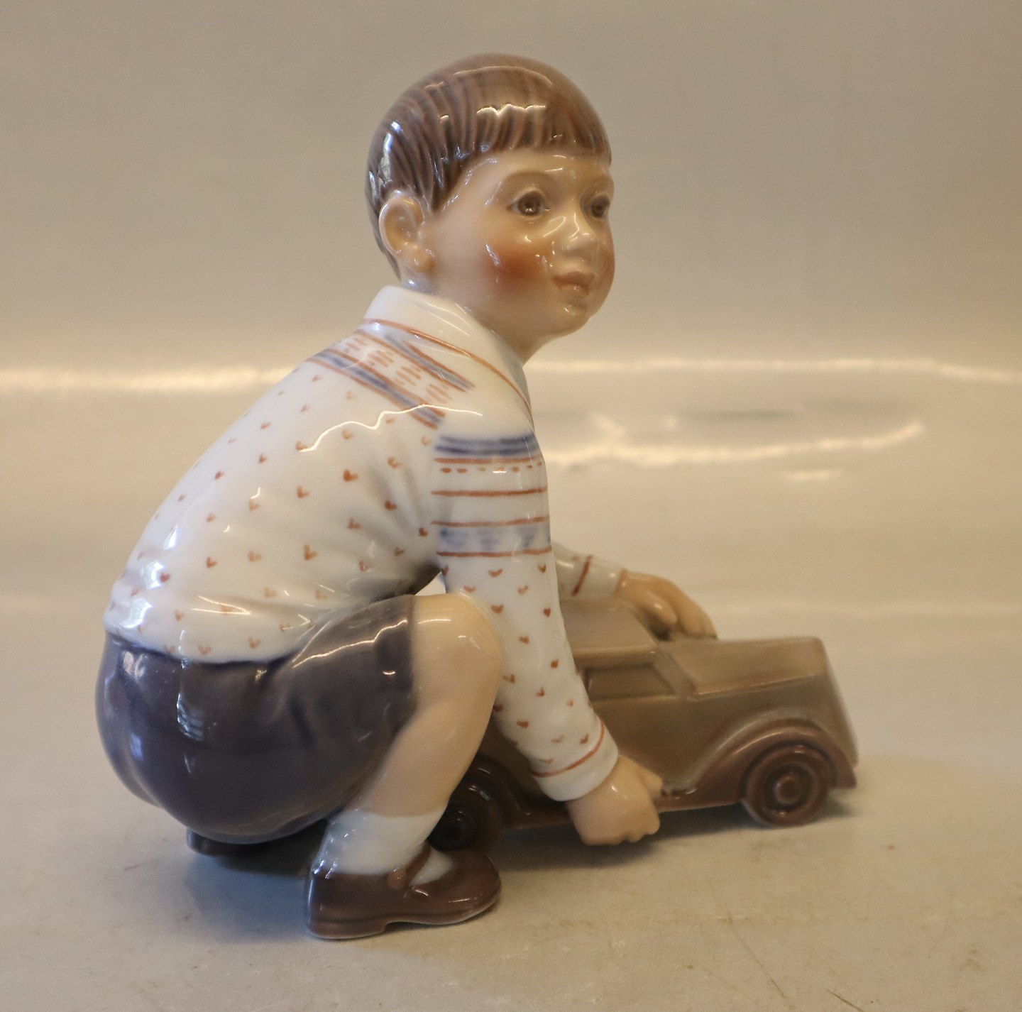 Beskrivelse: Dahl Jensen 1166 Dreng med bil 14 cm (DJ). Mærket med kongelig krone og DJ Copenhagen i hel og fin stand.