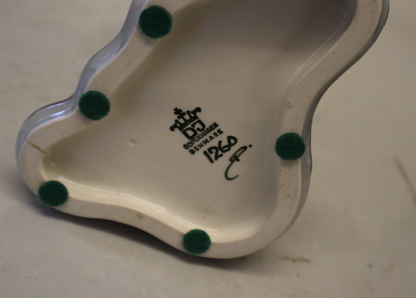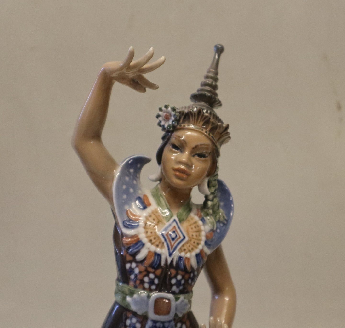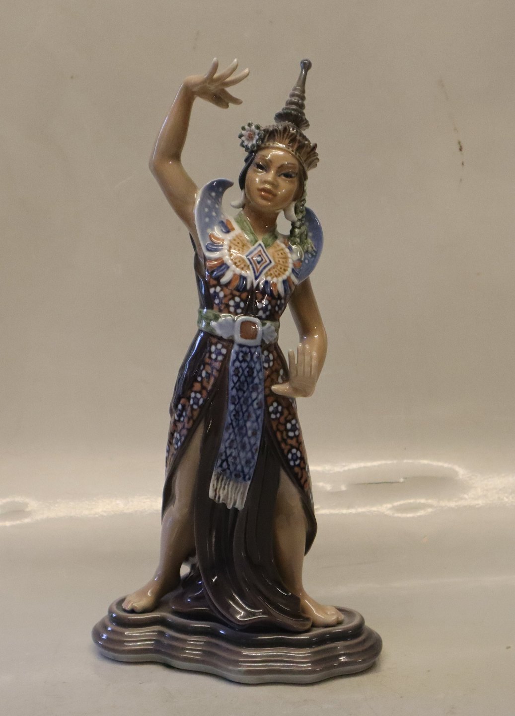 Dahl Jensen 1260 Indokinesisk tempeldanserinde 29 cm (DJ). From Thailand Mærket med kongelig krone og DJ Copenhagen i hel og fin stand bortset fra en brændingsrevne på undersiden - se billeder