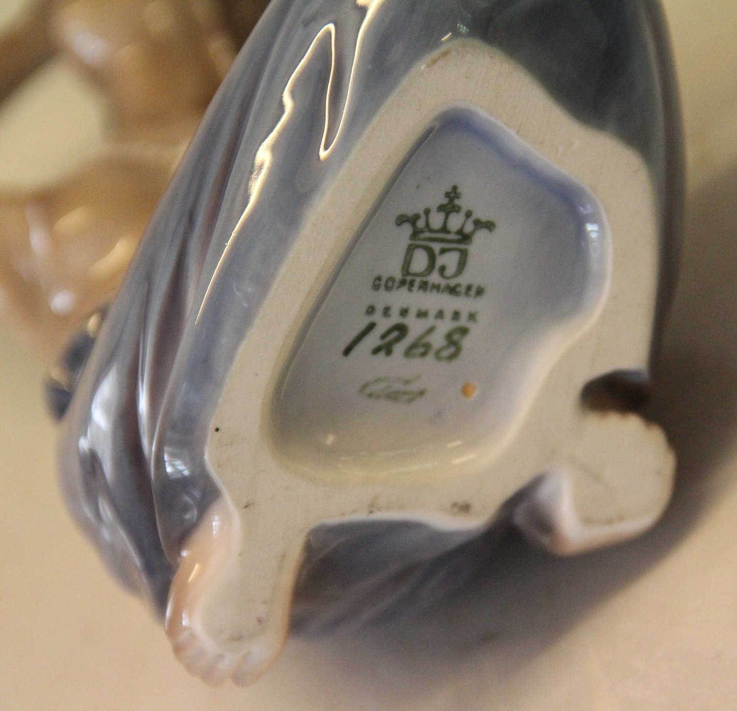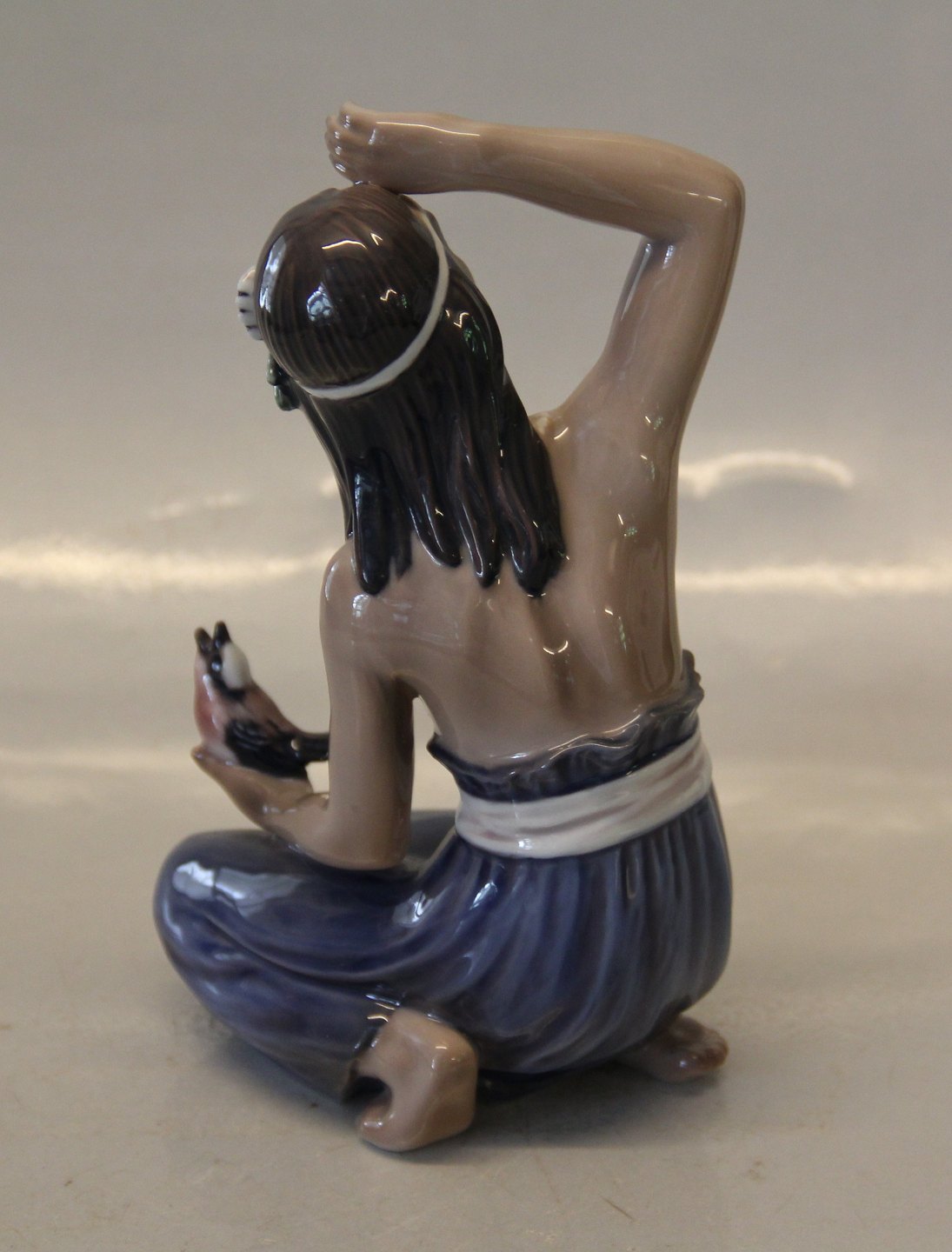 Beskrivelse: Dahl Jensen 1268 Hawaii-pige med fugl 16,5 cm (DJ). Mærket med kongelig krone og DJ Copenhagen i hel og fin stand.