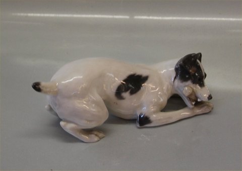 Beskrivelse: Kgl. figur fra Royal Copenhagen Glathåret fox terrier ? 0704 Kgl. Hund gnavende ben Christian Thomsen 9 x 23 cm Farve: Sort version . sort i hel og fin stand