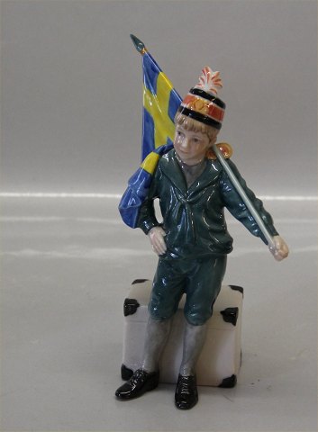 Beskrivelse: Kgl. figur fra Royal Copenhagen Dreng fra Sverige med svensk flag og kiste 18 cm Carl Larsonfigur 'Pontus'