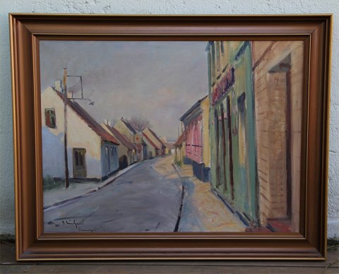 : Maleri Østergade i Mariager 1956 62 x 79 cm