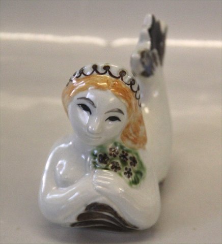 Aluminia kunstfajance 338-3670 Aluminia Fajance Figur: Havfrue liggende med blomster buket 9 x 11 cm Doreen Middelboe 1969