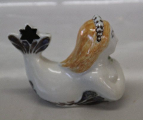 Beskrivelse: Royal Copenhagen Aluminia fajance 338-3670 Aluminia Fajance Figur: Havfrue liggende med blomster buket 9 x 11 cm Doreen Middelboe 1969