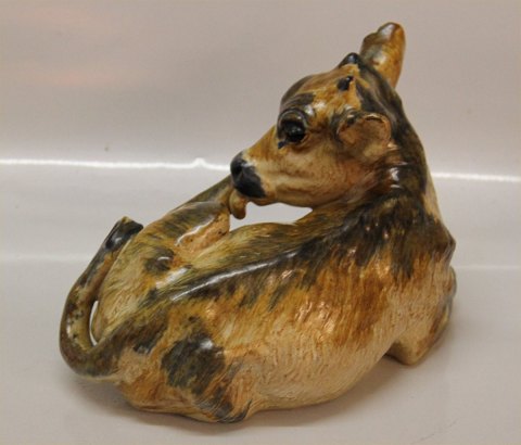 Beskrivelse: Arne Ingdam Jersey Kalv 16,5 x ca 25 cm Jersie ko. Arne Ingdam 1922, født på Amager, uddannet på Den kongelige Porcelainsfabrik, arbejde de meste af sit liv fra sit eget værksted og hjem i Rågeleje, hvor han afsatte sine værker privat og igennem Magasin du Nord