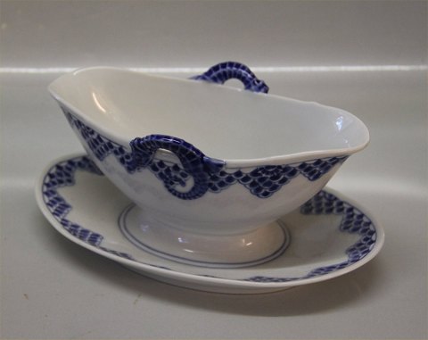 Beskrivelse: Bing & Grøndahl Kronberg 008 Sovseskål med hank 11 x 24 cm 3,5 dl (311) Hvidt porcelæn, blå halvblonde med gennembrudt bort, form 356 I fin og hel stand Bing & Groendahl