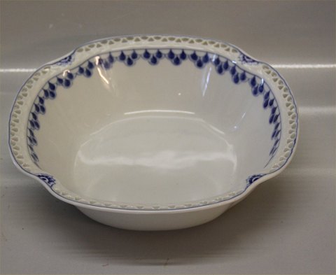 Beskrivelse: Bing & Grøndahl Kronberg 043,6 Kartoffelskål 8,5 x 22 cm (313,6) gennembrudt kant Hvidt porcelæn, blå halvblonde med gennembrudt bort, form 356 I fin og hel stand Bing & Groendahl