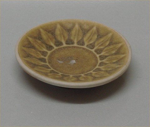 Bing & Grøndahl B&G Relief 332 Kuvert smør 7,5 cm (1969) Quistgaard Nissen Kronjyden stentøjsstel. I fin og hel stand. Bing & Groendahl. Stemplet Kronjyden eller Bing & Grondahl Copenhagen Stoneware: Bladformet mønster i releif på gult stentøj af Quistgaard for Kronjyden, Nissen.