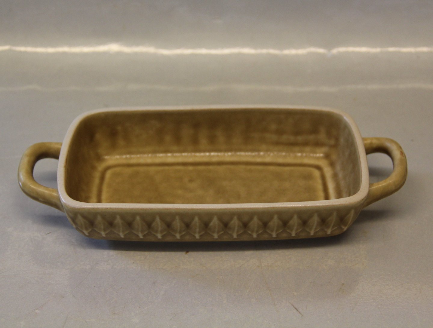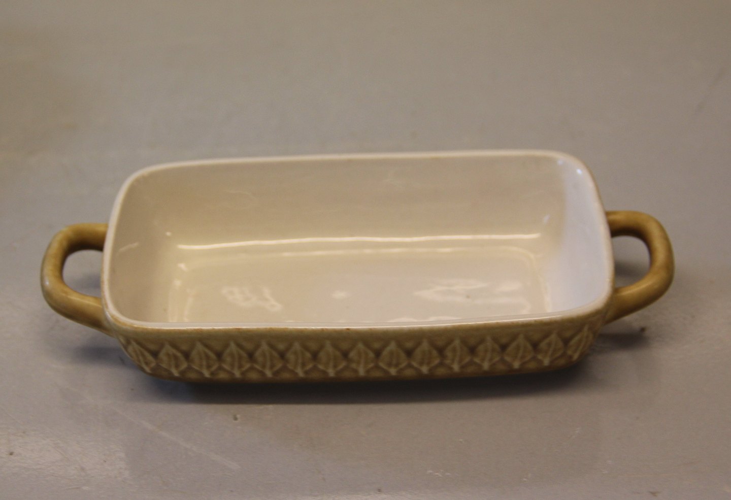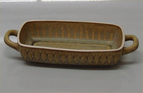 Bing & Grøndahl B&G Relief 356 Asiet med hanke, aflang 3.5 x 19 x 8 cm Quistgaard Nissen Kronjyden stentøjsstel. I fin og hel stand. Bing & Groendahl. Stemplet Kronjyden eller Bing & Grondahl Copenhagen Stoneware: Bladformet mønster i releif på gult stentøj af Quistgaard for Kronjyden, Nissen.