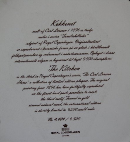 Beskrivelse: Kgl. "Køkkenet fra 1896 Motiv 3. fra serien Familiebilleder. Rund Carl Larsson porcelænsplatte i træramme 26 cm fra Royal Copenhagen Begrænset oplag nr. Af 9500 I hel og fin stand Brugsspor på rammen
