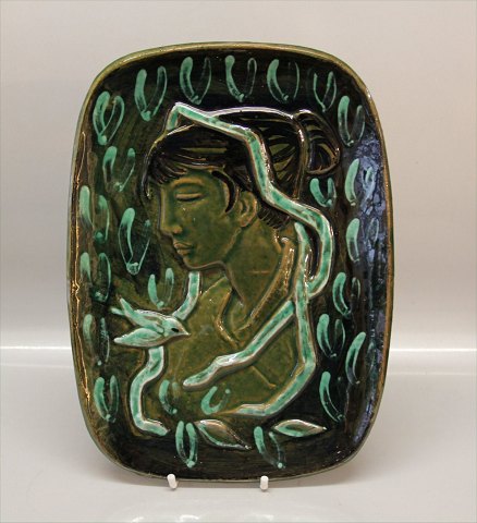 Grønglaseret Relief Kvinde og fugl 33 x 24 cm Signeret HC Helge Christoffersen