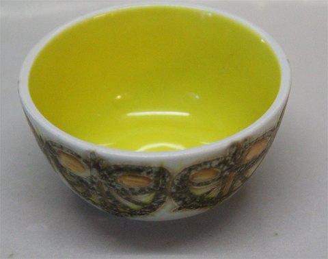 Beskrivelse: Royal Copenhagen Aluminia fajance 658-3474 Lille skål indvendig gul 4 x 8,5 cm Baca Ellen Malmer
