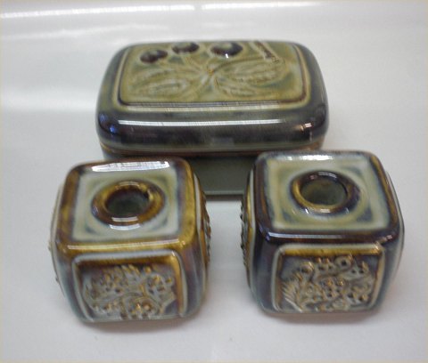 SMørskål og lysestager i grøn stentøjsglasur med relief