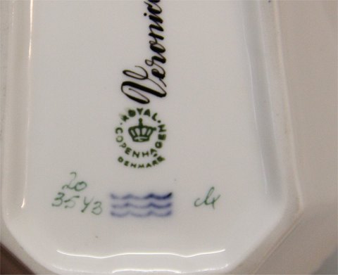 Beskrivelse: Royal Copenhagen Flora Danica Blomstermotiver på guldbelagt perlestel. 20-3543 Veronica præcox All. Aflang asiet nyt nr: 343 18 cm 1. sortering i fin og hel stand
