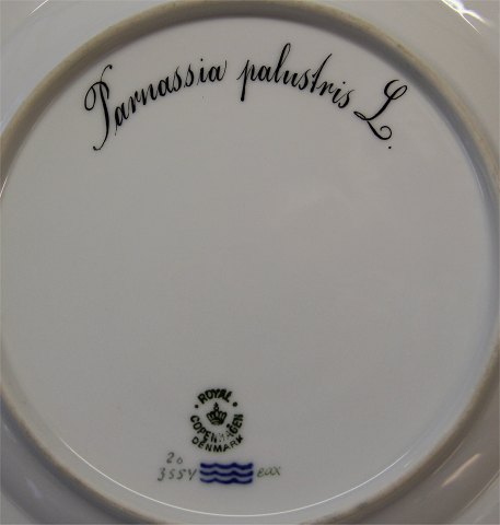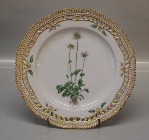 Beskrivelse: Royal Copenhagen 20-3554 Fad til lille rund frugtkurv, flad tallerken med gennemskåret bort 23 cm. Parnassia palustris L. Fra år 1947. Flora Danica Blomstermotiver på guldbelagt perlestel. 1. sortering i fin og hel stand