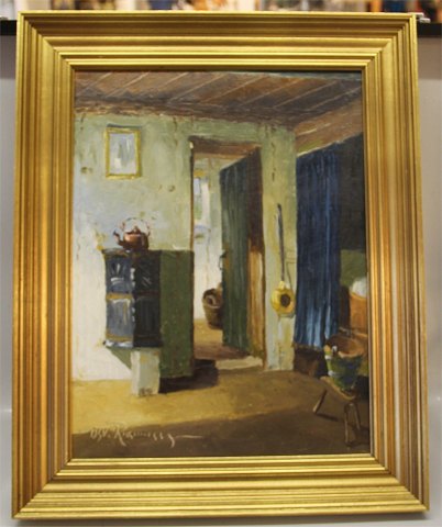 : Maleri: Interiør Osvald Rasmussen 51 x 41 cm inlusiv flot Guldramme Olie på lærred
