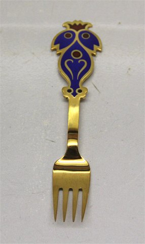 Beskrivelse: Anton Michelsen Julegaffel 1974 Den blå fugl Forgyldt sølv med emaljedekoration. Design: Carl-Henning Pedersen