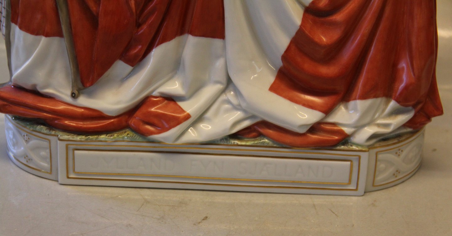 Beskrivelse: Kgl. egnsfigur fra Royal Copenhagen 12226 Kgl. Gruppe på tre i egnsdragter og det danske flag fra Danmark 34 cm I hel og fin stand