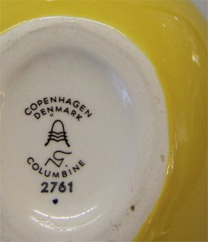 Beskrivelse: Royal Copenhagen Aluminia fajance Columbine 2761 Aluminia gul, hvid og blå blomsterholder - høne 17 x 10.5 cm, januar 1958
