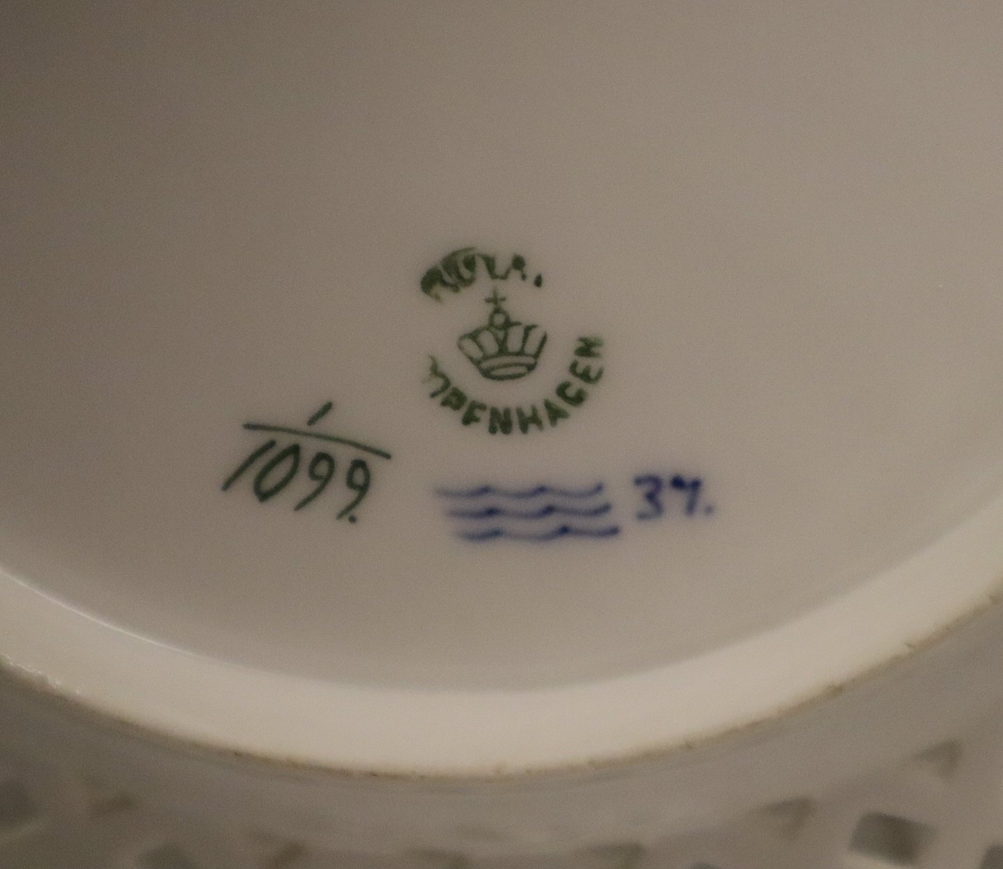Beskrivelse: Kongelig Dansk Porcelæn Musselmalet Helblonde 1099-1 Tallerken, flad m/gennembrudt kant og rosetter til 1050 (Se listing andet sted) 23,3 cm I fin og hel stand