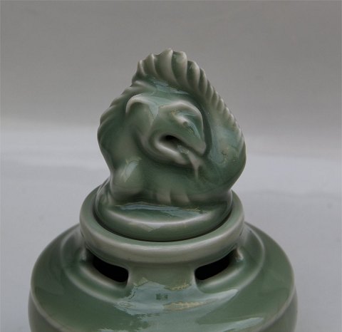 Beskrivelse: Royal Copenhagen stentøj 2311 Jais Nielsen Celadon krukke med låg I fin og hel stand