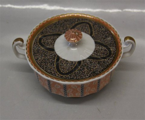Beskrivelse: 160-161 Sukkerskål 17 cm (8563) Royal Copenhagen Fairytale. Inspireret af Gerhard Hennings figurer af samme navn. Et kompleks flerfarvet transfer mønster på den kantede form som Blå Blomst Kantet. Design Finn Næss-Schmidt og Jørgen Nielsen. De grå dele har nummer 1201, terrakotta 1202 og serveringsdele med lidt af hvert 1203.