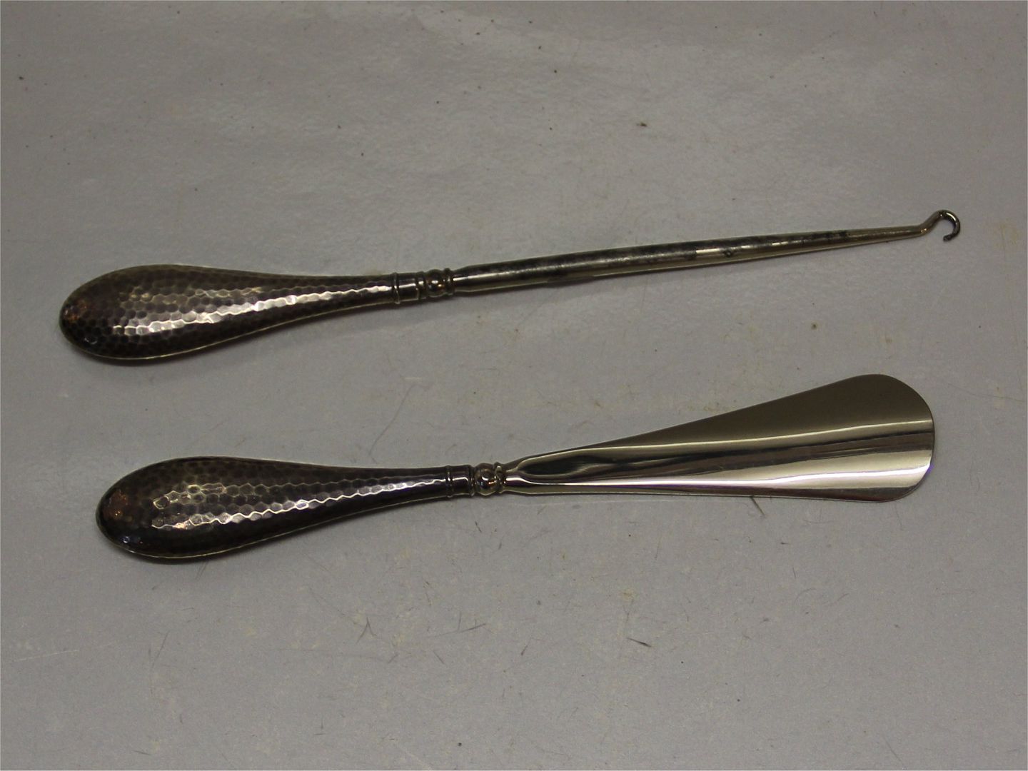 Beskrivelse: Engelsk sølv Sløjfeløser med krog 15 cm (skohorn solgt) Hammeret søvl Engelske Sølvmærke blad/krog English Made steel