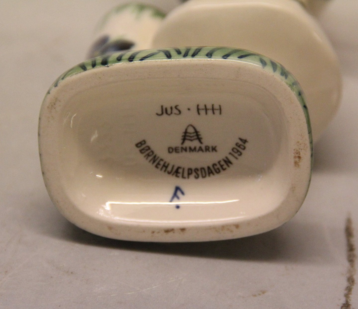 Beskrivelse: 1964 Skjoldmø # 3333 Aluminia fajance Børnehjælpsdagsfigurer. Børnehjælpsfigurerne blev designet i skønvirke stil af Herluf Jensenius og formgivet af Hans Henrik Hansen (1941-1965) for at fejre børnehjælpsdagen. JUS Pige med guldhorn Skjoldmøen