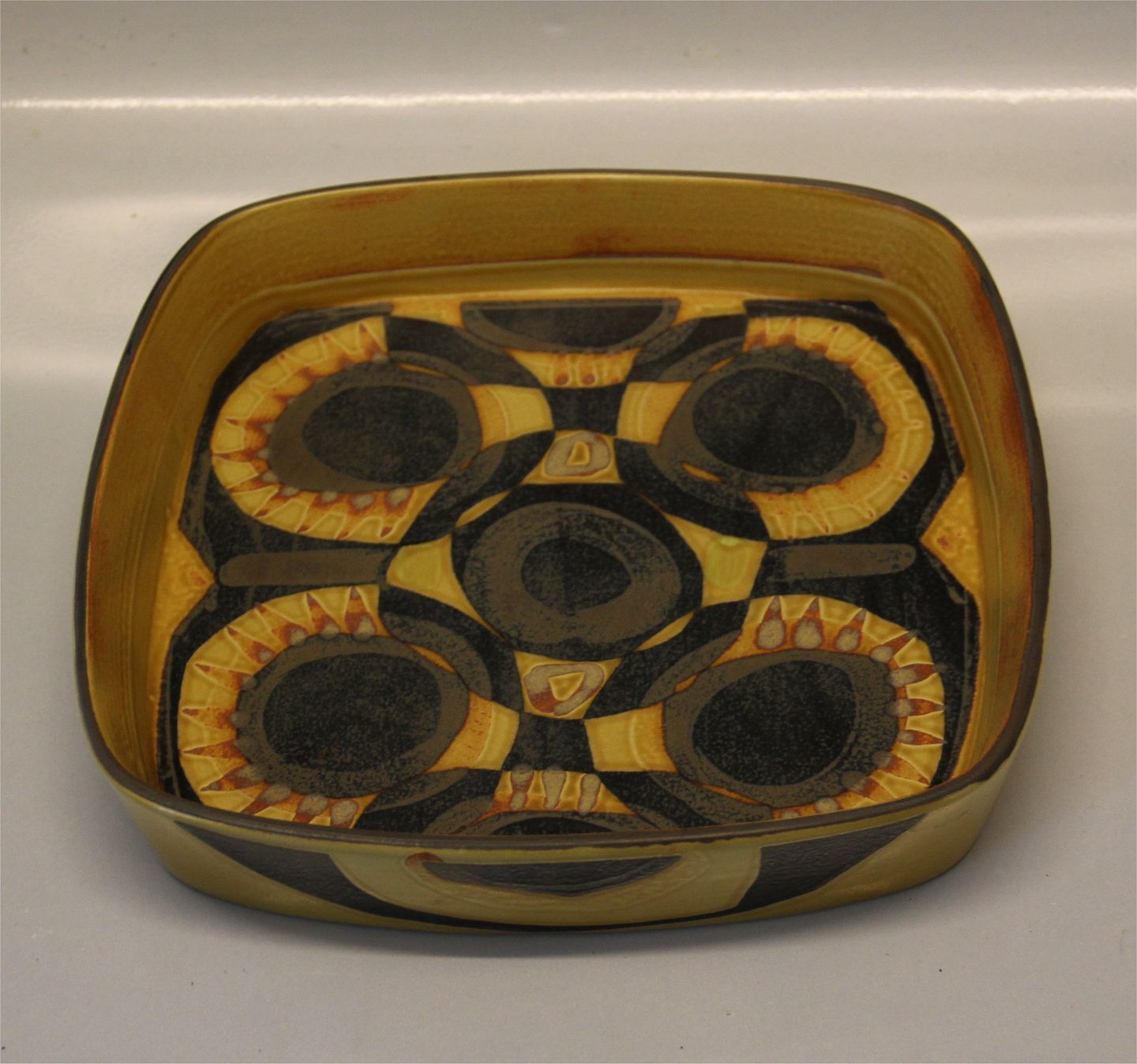 Beskrivelse: Royal Copenhagen Aluminia fajance 790-2885 Firkantet gul skål, stor 26,6 x 26,6 cm Baca. Nils Thorsson