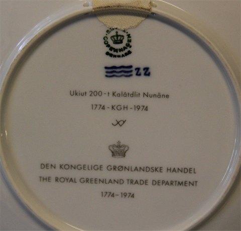 Beskrivelse: Kgl. platte fra Royal Copenhagen 1774-1974 Kgl. KGH Den Kongelige Grønlandske Handel 20.5 cm Ukiut 200-t Kalardlit Nunane I hel og fin stand