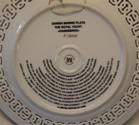 Beskrivelse: Kongeskibet "Dannebrog" Paltte 27,5 cm Lavet af I. Midtgaard Art wares Copenhagen Denmark Limited 2000 I samme stil og form som B&G's Windjammer platter nr 31 af 2000
