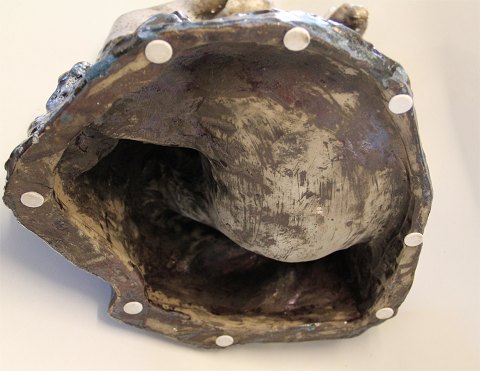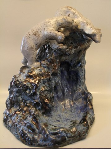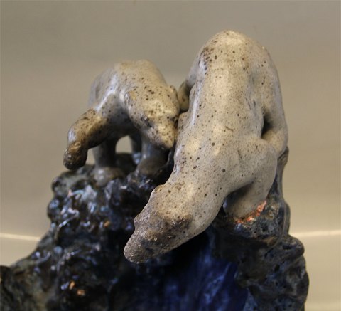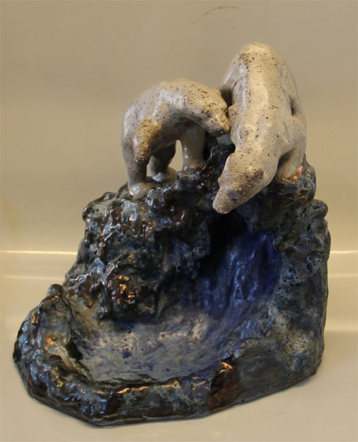 Beskrivelse: Kæmpe Bjørnegruppe r glasur ca 40 x 40 cm Søren Kongstrand og Jens Pedersen Kæmpe figur med to Isbjørne på klipper