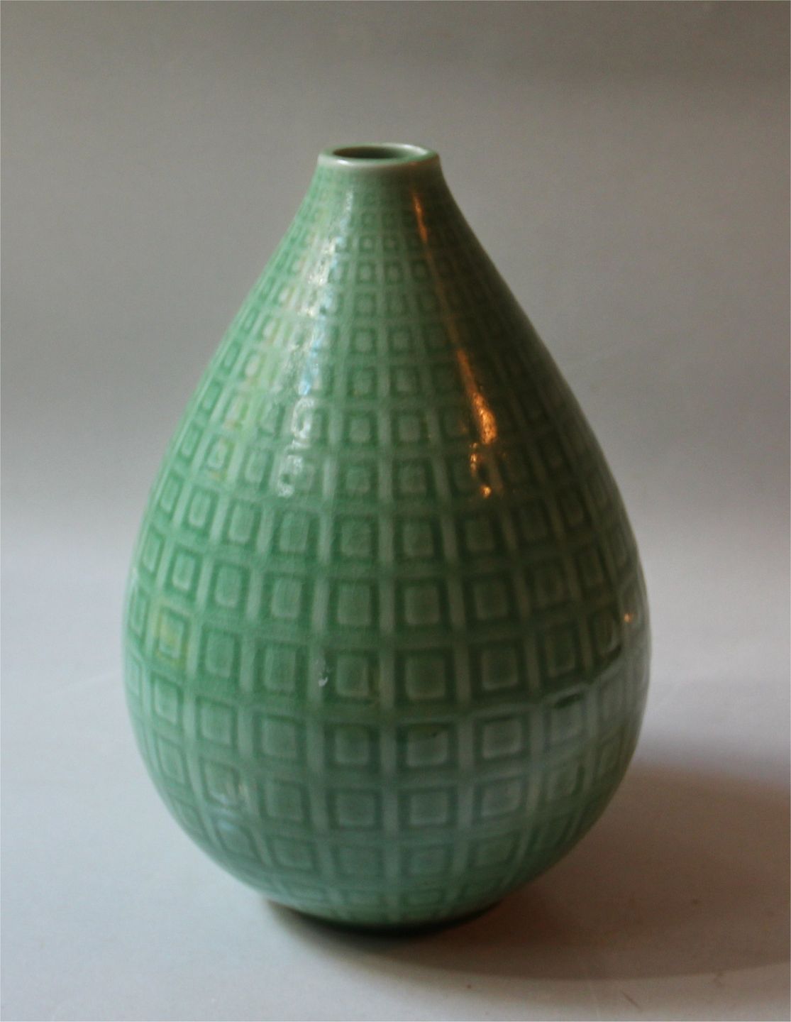Aluminia kunstfajance 2631 Marselis Grøn Vase, stor pæreformet med små kvadrater 21 x 15 cm Nils Thorsson 1953