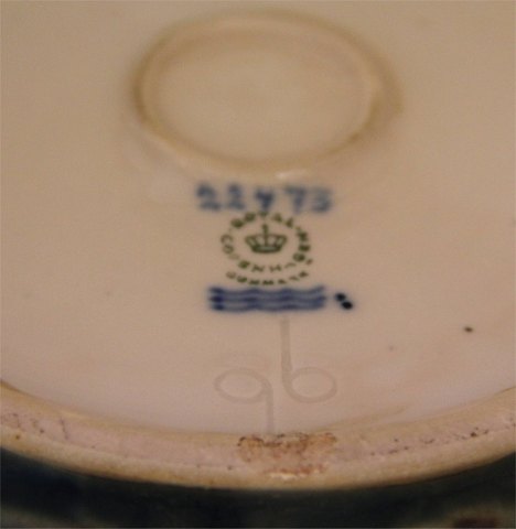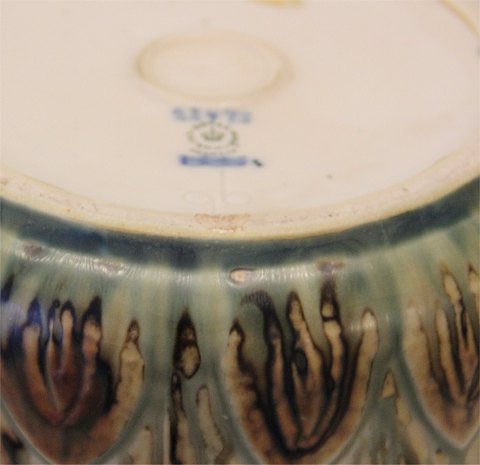 Beskrivelse: Royal Copenhagen stentøj 22473 Kgl. Urtepotte skjuler, skåret af glat 22447 15 x 18.5 cm November 1971 Gerd Bøgelund I fin og hel stand