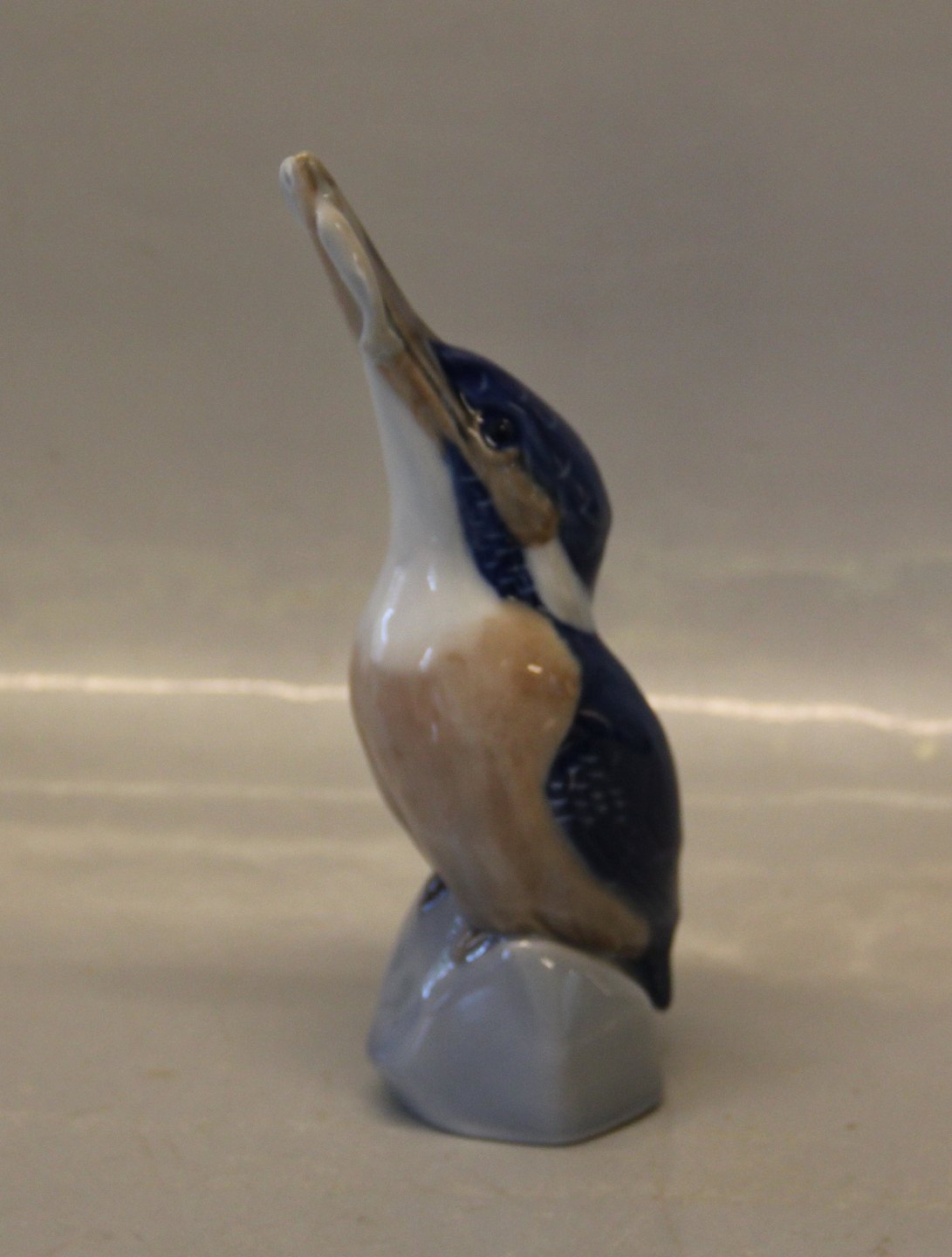 Beskrivelse: Kgl. figur fra Royal Copenhagen 2257 Kgl. Isfugl med fisk 18 cm Peter Herold 1915 Kingfisher I hel og fin stand