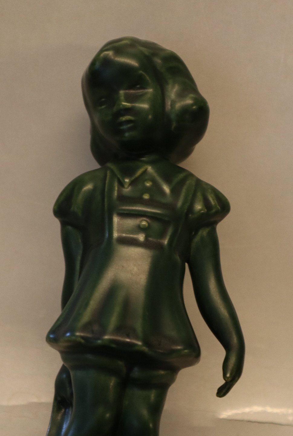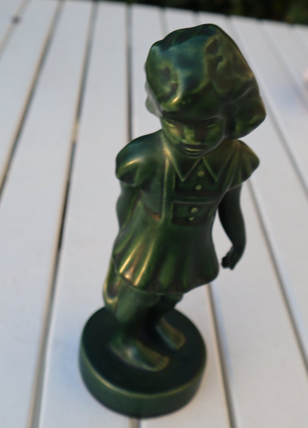 Keramik fra P. Ipsens Enke Kgl. Hof. Terracottafabrik 1843-1955 Pige 926 926 I Ipsen Jadegrøn Forlegen (Lille Pige med Strandsko) 19 cm Verner Hancke 1941