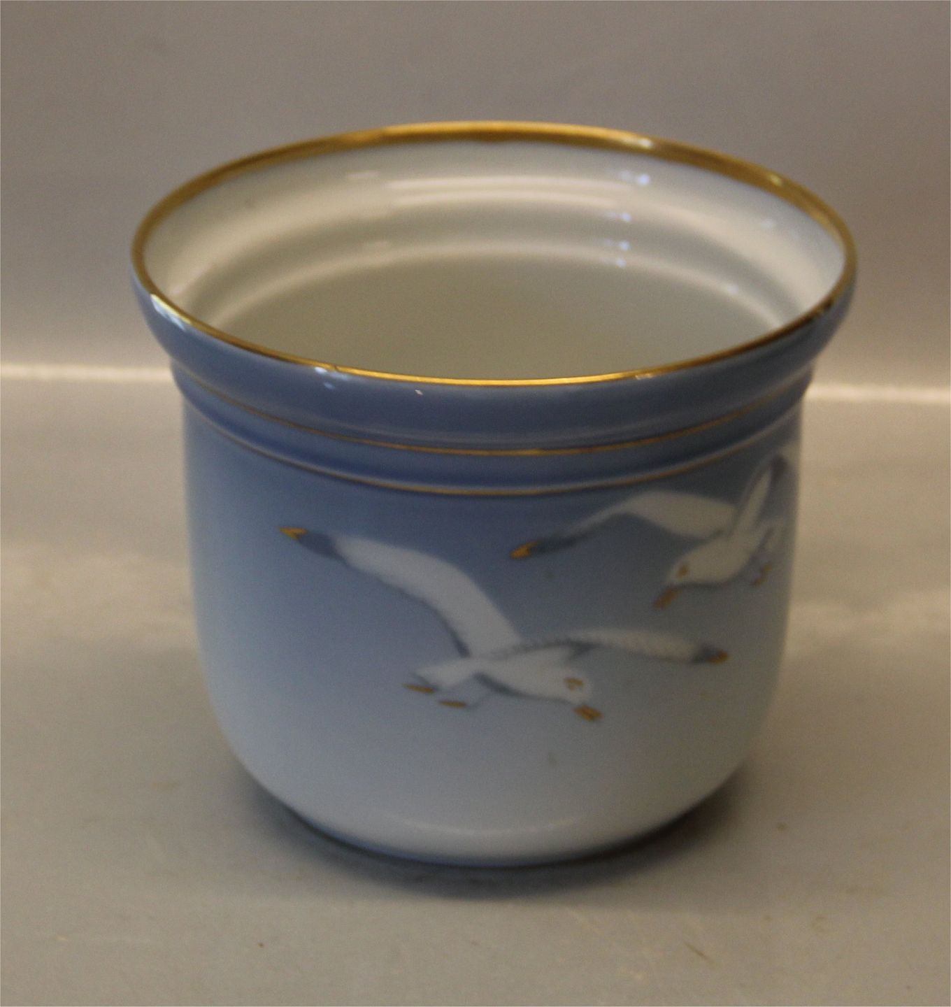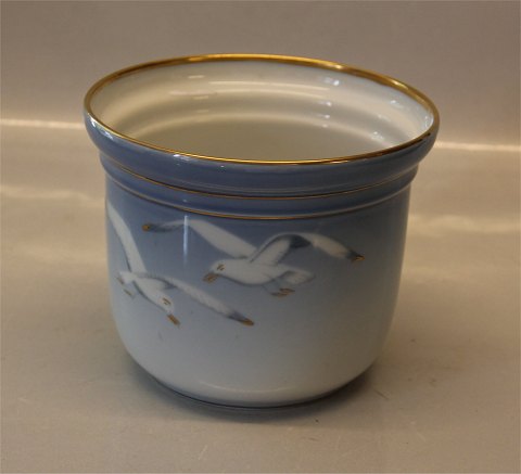 Beskrivelse: Bing & Grøndahl Mågestel med guldkant 668 Urtepotteskjuler (lille) 11 x 14 cm. I hel og fin stand