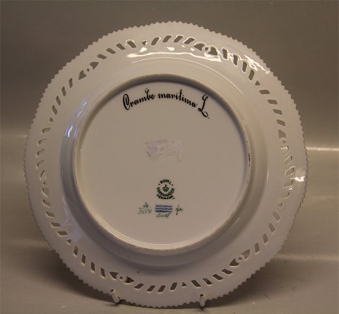 Kongelig Dansk Porcelæn Flora Danica 20-3554 Fad til lille rund frugtkurv, flad tallerken med gennemskåret bort 23 cm Crambe maritima L . Fra år 1961.