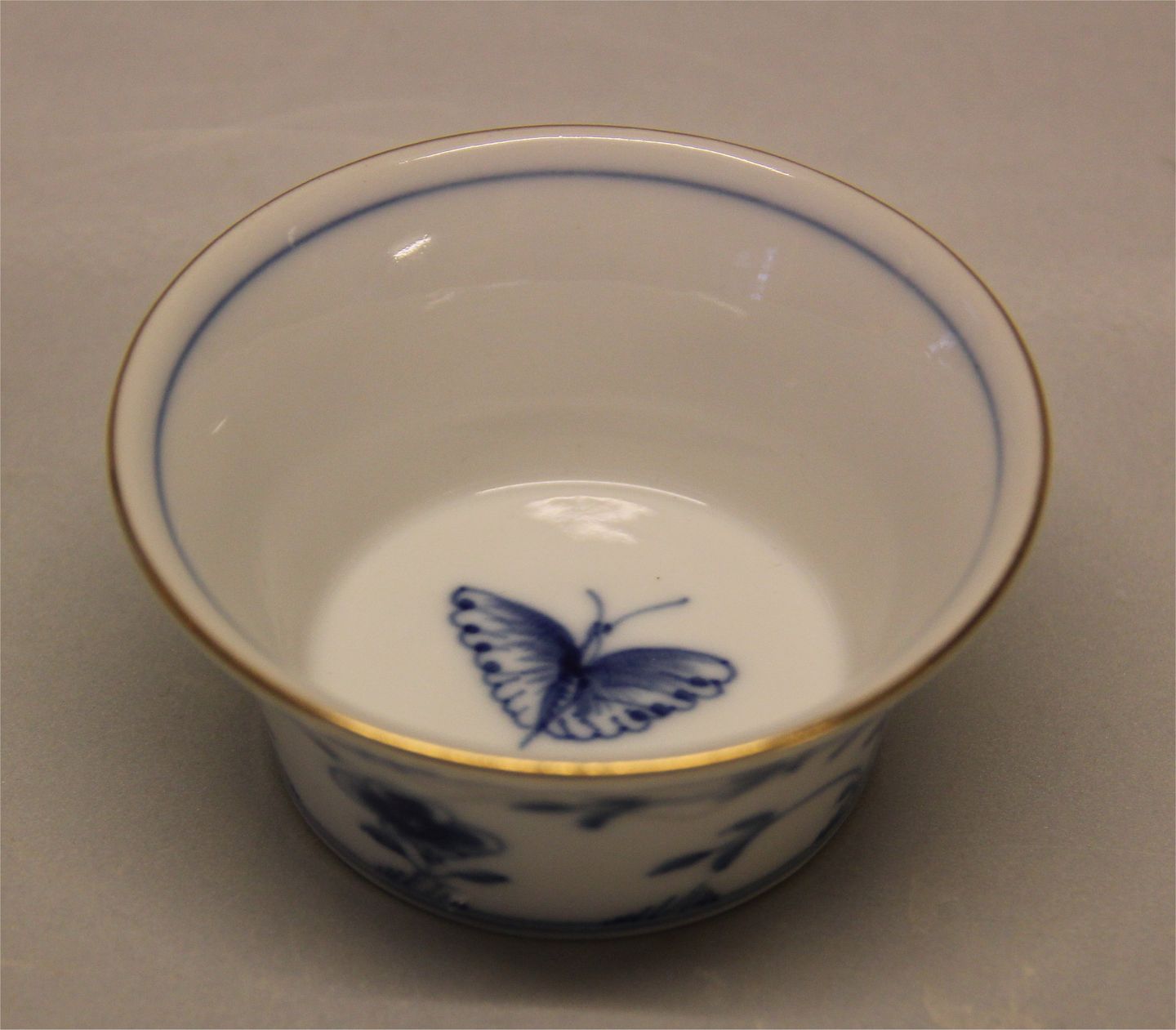 193 Lille rund skål d: 8,5 cm. Til tesi B&G Blåmalet Kipling Sommerfugl med guld