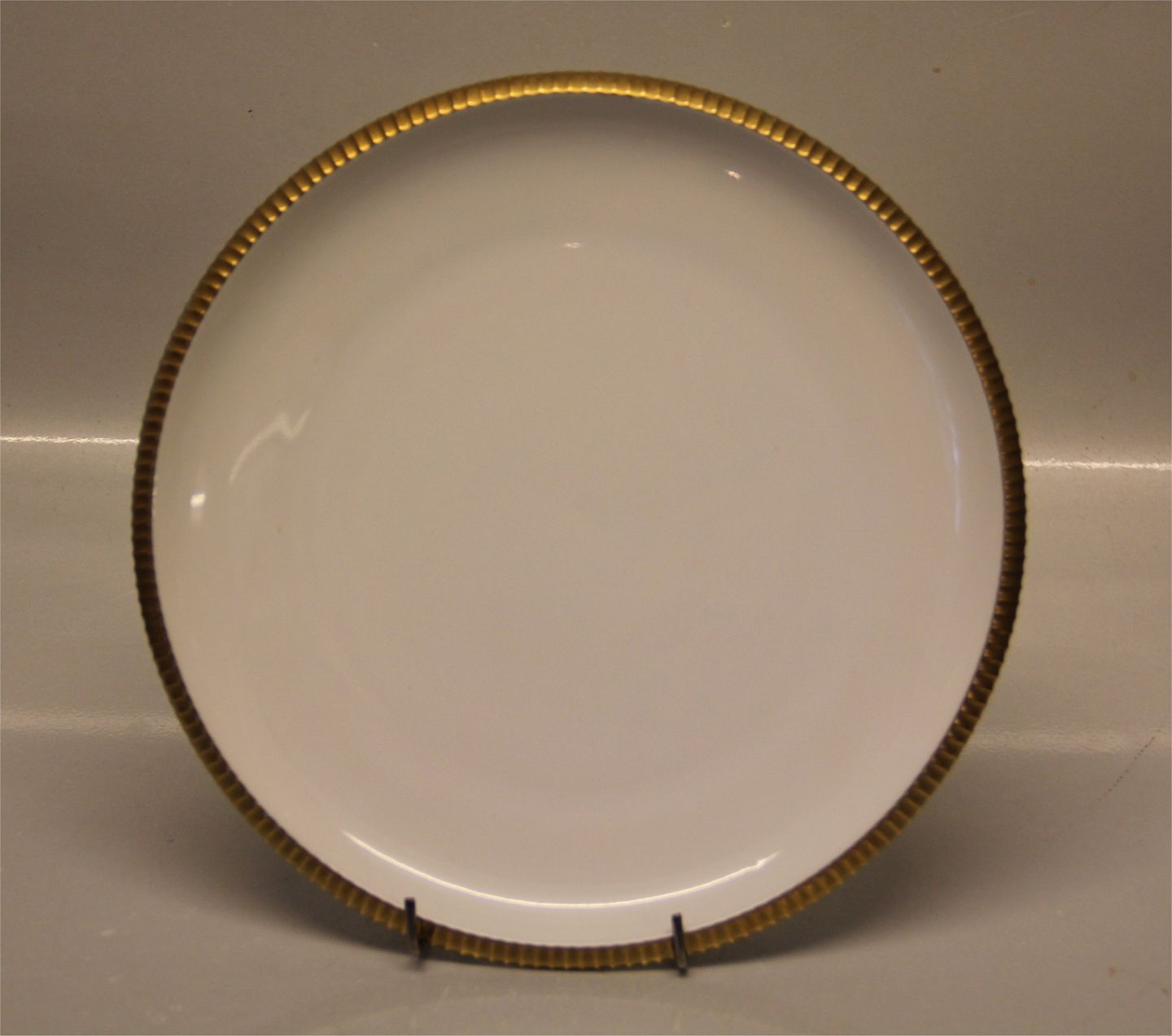 025 Middagstallerken 24 cm (325) Golden Sun - Gylden Sol. Form 674 er formgivet af Sigward Bernadotte. Denne form findes i hvidt, med bred guldkant (Gylden Sol), med smal guldbelægning på inderkanten (Vega), med grønt og guld (Perseus), med rødt og guld (Herkules) og beige og guld (Norma).